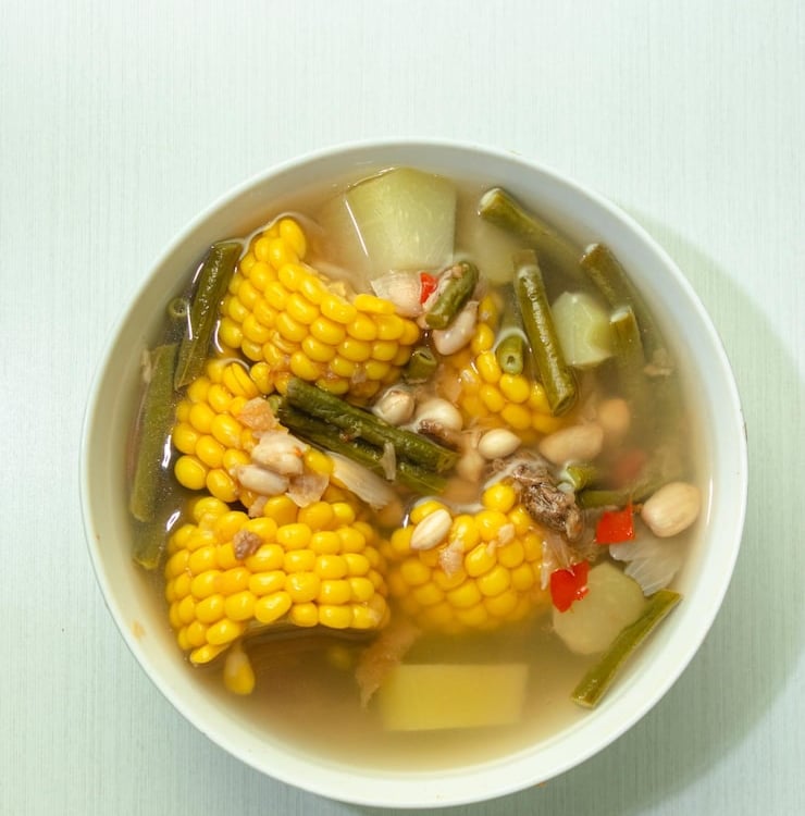 Masukkan Bahan Keras: Masukkan jagung manis, melinjo, dan kacang tanah dari Sayur Asem Set. Masak hingga setengah matang.